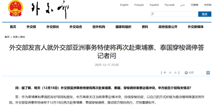 答:作为柬埔寨和泰国的友好邻邦和朋友,中方高度关注当前柬泰边境冲突,持续穿梭劝促,以自己的方式积极为推动缓局降温发挥作用。外交部亚洲事务特使将于12月18日再次赴柬埔寨、泰国穿梭调停,推动双方相向而行,尽快重建和平。